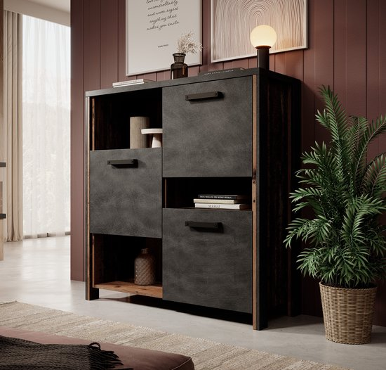 Het gebruikte materiaal voelt solide aan en de kleurencombinatie van antraciet en eiken geeft het dressoir een moderne industriële uitstraling zonder dat het ten koste gaat van de kwaliteit. Zelfs de planken binnenin zijn dik genoeg om te weten dat ze veel gewicht kunnen dragen zonder door te buigen.