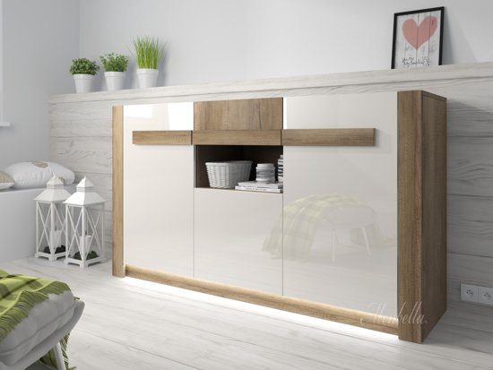 Een prima basis voor van alles en nog wat, wat je er ook in, op of naast wilt zetten, het kan allemaal. De True Furniture Seven is een prima dressoir en dat zul je ontdekken. In het midden, aan de bovenkant zijn twee brede laden. Er onder en ernaast drie kastjes met deuren zonder grepen, waardoor dit dressoir inderdaad een gladde en strakke verschijning is. Twee kasten aan weerszijden zorgen voor een zeer ruim dressoir. Er zijn in totaal drie kastdeuren, in hetzelfde patroon als de ombouw, zodat er vrijwel geen onderscheid is. Toch is alles gemakkelijk te openen en te sluiten.