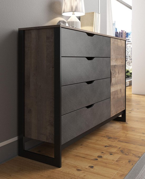 Een efficiënte opberger en een handige aanvulling op de leefruimte, dat is wat de Commode Acasia biedt. Uitgerust met één deur en vier ruime lades, gooit dit meubelstuk hoge ogen als het aankomt op het ordelijk wegstouwen van alledaagse spullen. Uitgevoerd in een modern tintje met een eikenkleurige afwerking en mat grijze lades, slaat dit meubelstuk nooit een slecht figuur in hedendaagse interieurs.